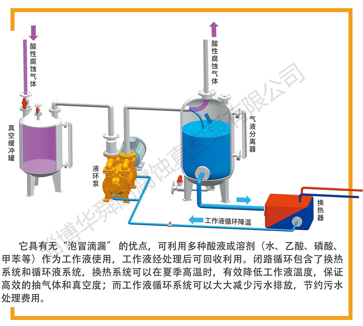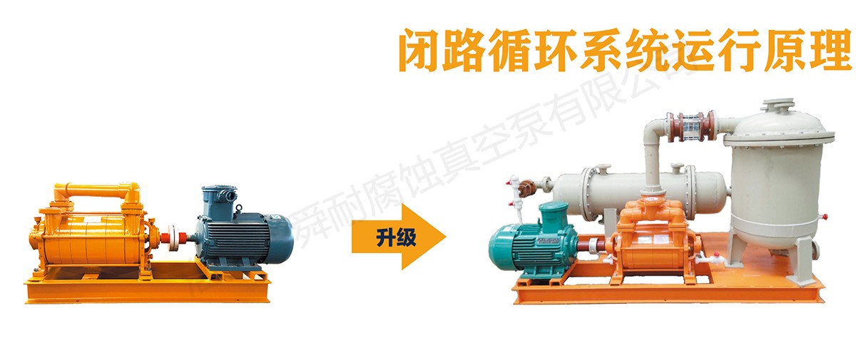 耐腐蚀液环泵可以升级为闭路循环系统,它由FSK系列、F2SK系列、F2BV系列、F2BE系列和JZJFS罗 茨泵系列,与真空换缓冲罐、汽液分离器、换热器、连接管路等串联组成。闭路循环与用户DCS连接可实现自动控制。
