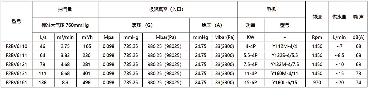 2.上列性能基于进气温度20℃,进水温度15℃,排气压力1013hpa的条件,被吸入气体为饱和空气。(饱和空气是指在对应吸入状态下,其相对湿度为100%的湿空气。)3.抽气速率、轴功率性能允差10%。